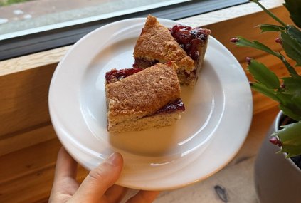 - In ein gebuttertes Blech streichen, mit Marmelade bedecken und zuletzt mit etwas Teig ein Gitter auf die Marmelade ziehen. Am besten funktioniert dies mit einer Spritzsocke.