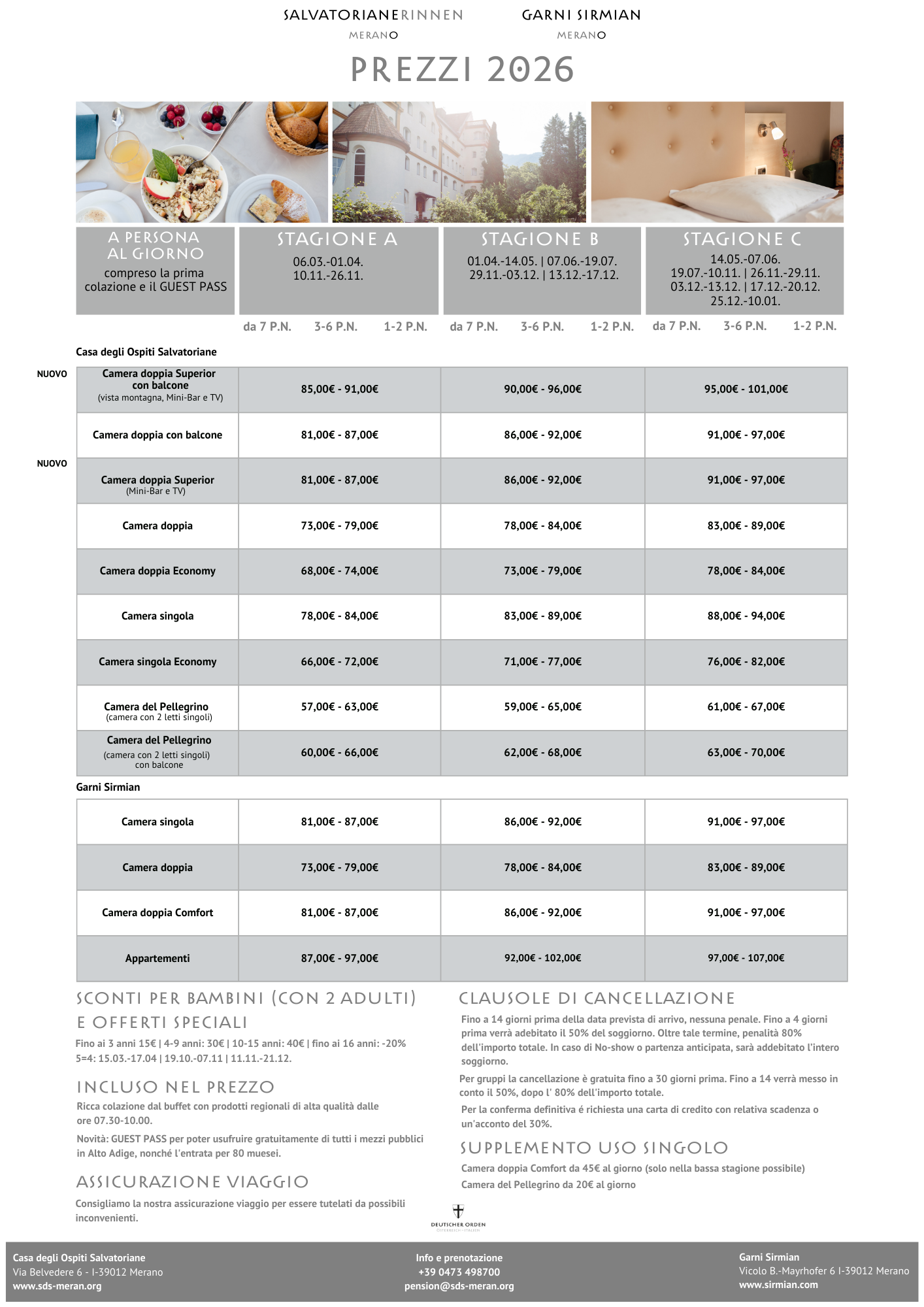 - In caso di cancellazione fino a quattro giorni prima dell'arrivo, ci riserviamo il diritto di addebitare il 50% del costo totale del soggiorno.